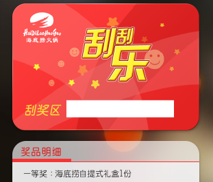 满足参与条件的用户,活动期间,找到页面中刮刮卡上的刮奖区,手指来回滑动,当白色区域刮完后,页面跳转弹出中奖结果(概率中奖,分中奖或未中奖)。刮刮乐(海底捞)